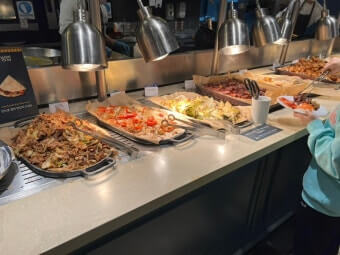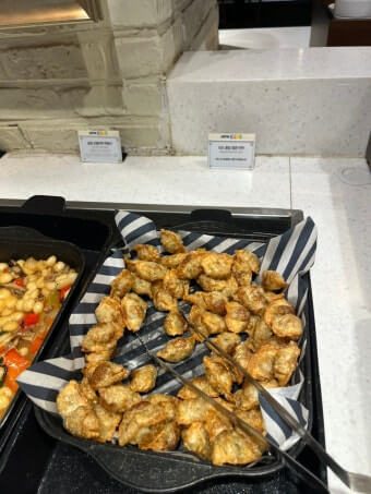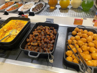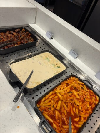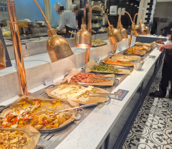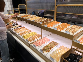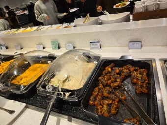 샐러드바에는 신선한 채소, 과일, 수제 드레싱이 다양하게 제공됩니다. 디저트로는 마카롱, 케이크, 젤라또가 제공되어 베이커리 카페 못지않은 퀄리티를 자랑합니다.